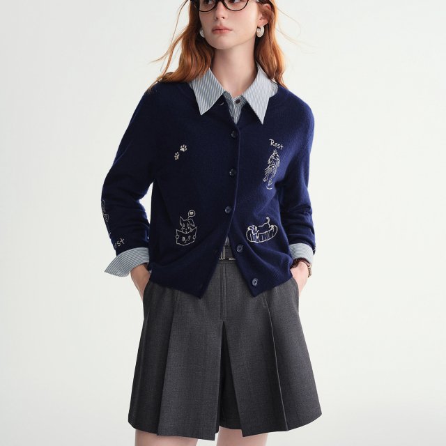 This cardigan stands out for its cute pet-inspired embroidery mixed with a classic knit silhouette. Unlike basic winter sweaters, it brings a fun, youthful energy while still being mature and wearable for everyday life. The medium-stretch wool fabric offers comfort without losing its shape, and the single-breasted, full-opening design makes it easy to layer over dresses, tops, or turtlenecks.