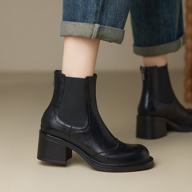 These boots combine thoughtful design with standout craftsmanship. The split leather exterior, brogue-style carving, and sleek ankle height create a refined retro look, while the soft inner materials and solid heel height provide comfort you can rely on. They are the perfect go-to boots for daily wear, offering a stylish blend of practicality and elegance.