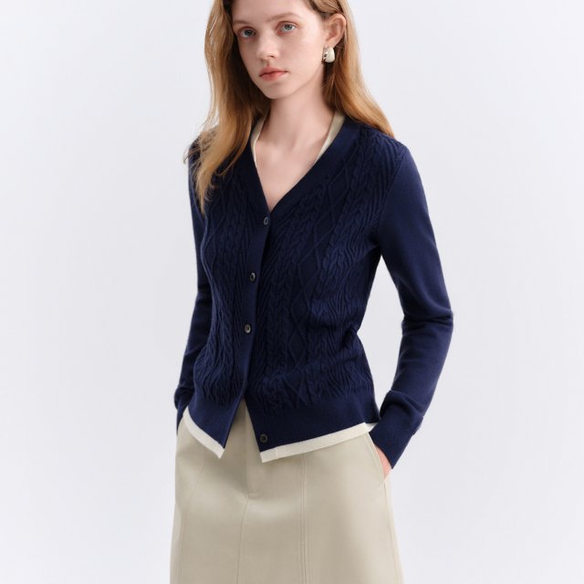 Winter V-Neck Cable-Knit Two-Piece Look Slim Cardigan Sweater