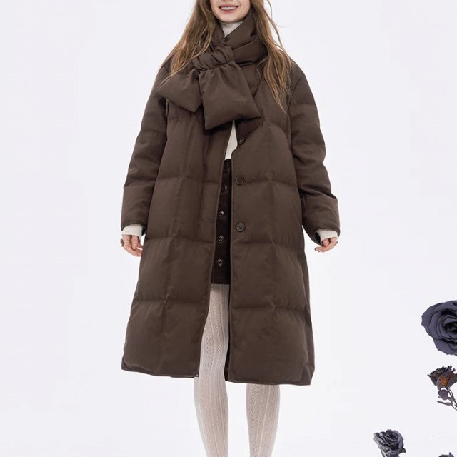 This long winter down jacket is designed for women who love comfort, clean style, and everyday practicality. It blends a preppy minimalist look with cozy warmth, making it a perfect outerwear choice for colder days. With its solid color design and built-in knit scarf detail, it keeps your outfit looking polished while protecting you from chilly winds.