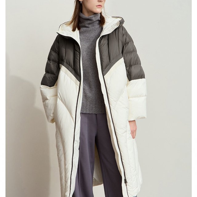 Stay warm, confident, and effortlessly polished this winter with this long hooded down coat designed for women who want comfort without sacrificing style. Crafted with a contrast patchwork design, this coat brings a modern, eye-catching touch to cold-weather dressing. Its thick white duck-down filling provides exceptional insulation, making it perfect for harsh winter days, commuting to the office, or enjoying weekend outings. With a clean, minimal look and soft broadcloth exterior, this winter essential brings together warmth, elegance, and practicality.