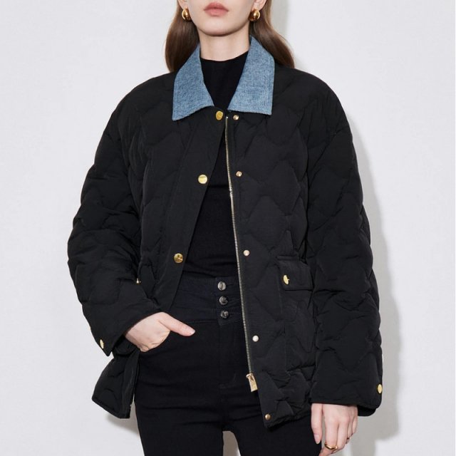 Meet your new cold-weather essential: a sleek, lightweight down jacket designed for women who want warmth without bulk. This piece blends a classic tailored silhouette with trendy denim splicing and patchwork details, creating a smart, fashion-forward look that works just as well for the office as it does for weekends out. With its structured lapel collar and smooth zipper closure, it delivers polished style while keeping you comfortably insulated.