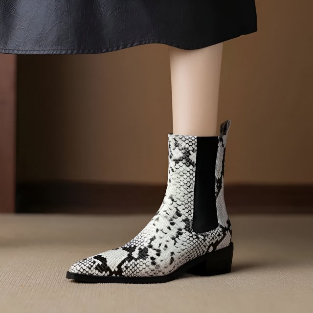 Women’s Snake-Pattern Western Boots with Pointed Toe and Chunky Heel